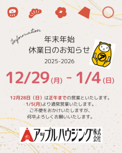 2025年12月29日(月)~2026年1月4日(日) 年末年始休業